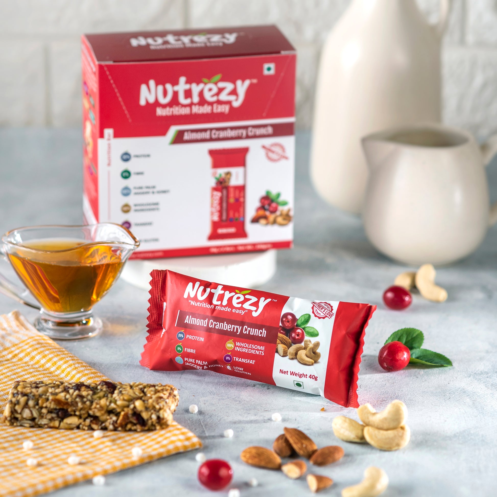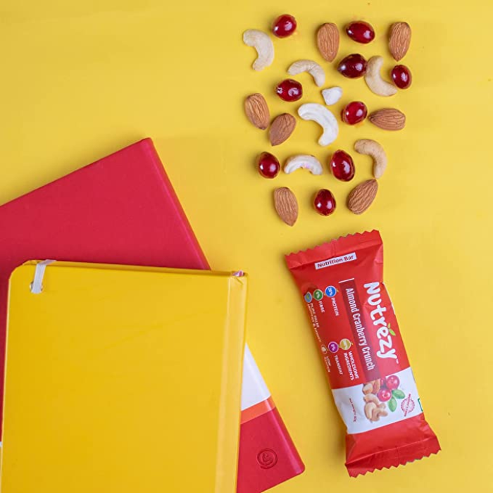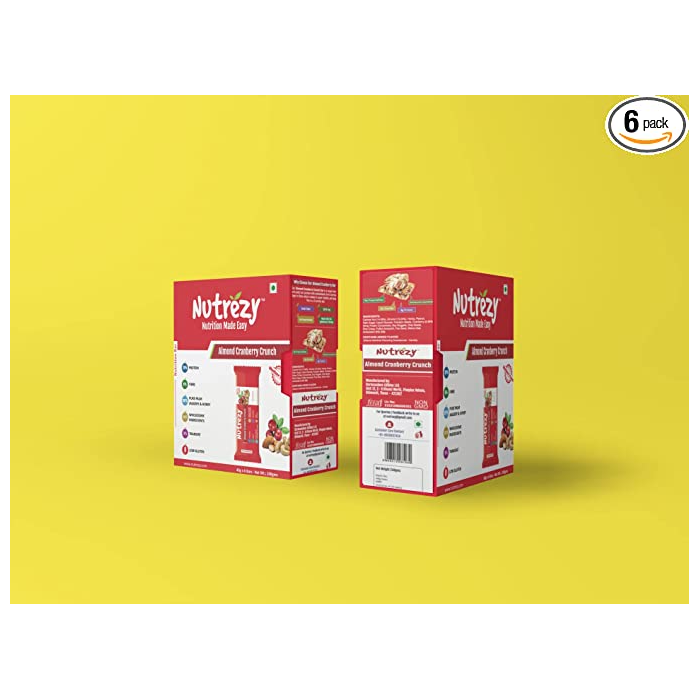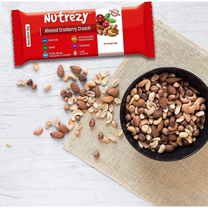 Nutrezy Almond cranberry crunch bar is the perfect low Gluten snack bar that matches the nutty palate to its best taste & possibility! A perfect melange of Cranberry, Cashew & Almonds! This is a crunchy bar that is full of berries and nuts! Our Bestseller since inception.