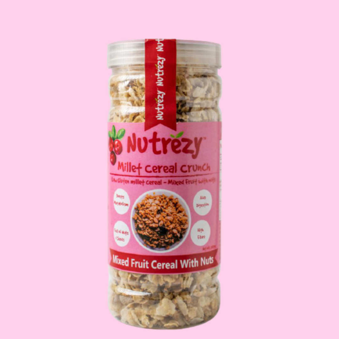 A Low Gluten cereal that is packed with the power of Millets and dried fruits that make the best combination with milk or yogurt. Our Millet Cereal is unique in its own manner. All our millets are procured directly from the farmers and are organic. This cereal is high in fibre and made with wholesome dried fruits and nuts.