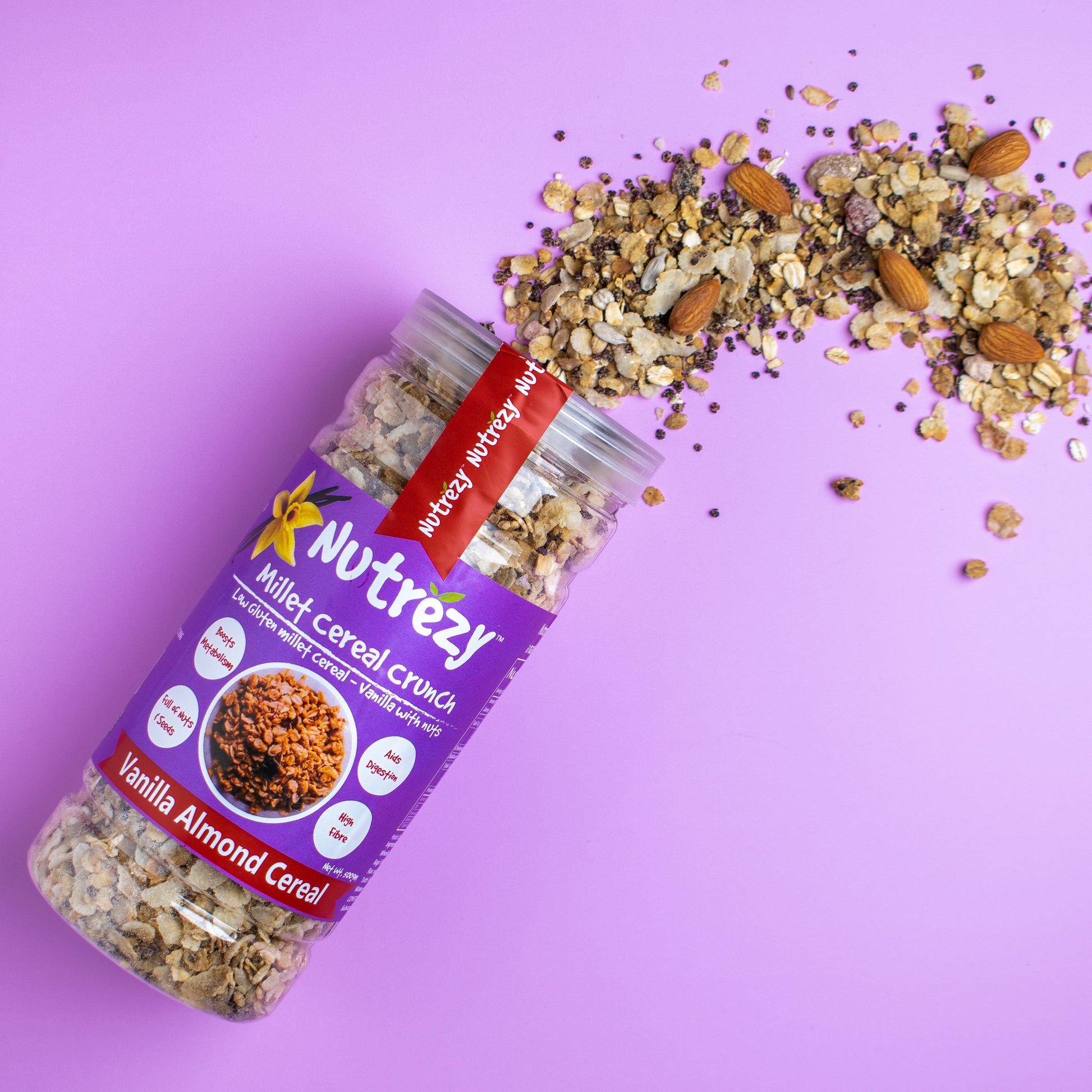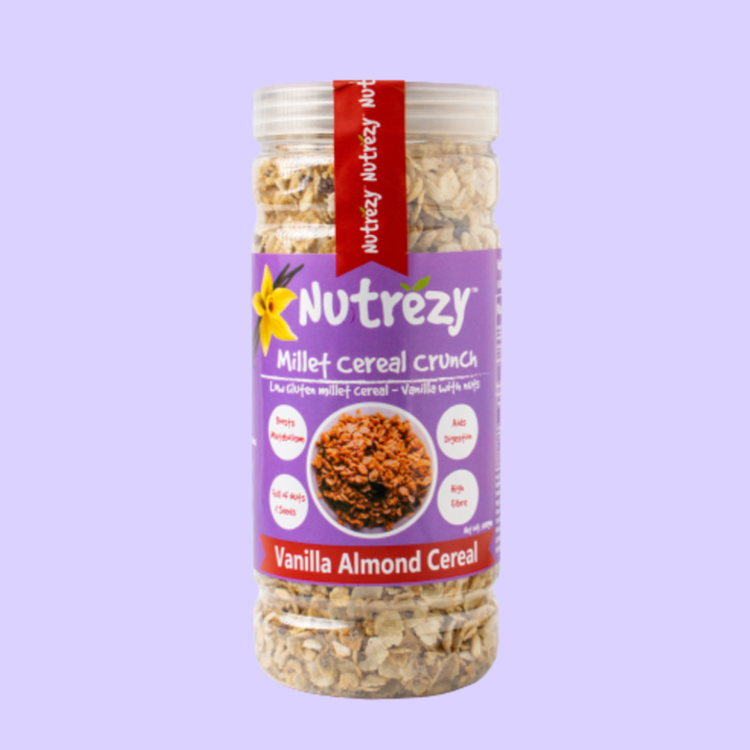 A Low Gluten cereal that is packed with the power of Millets and almonds that make the best combination with milk or yogurt. Our Millet Cereal is unique in its own manner. All our millets are procured directly from the farmers and are organic. This cereal is high in fibre and made with wholesome nuts.